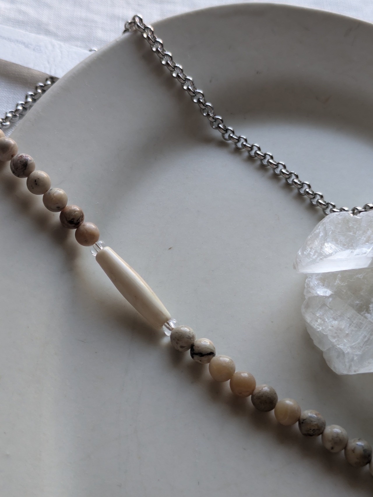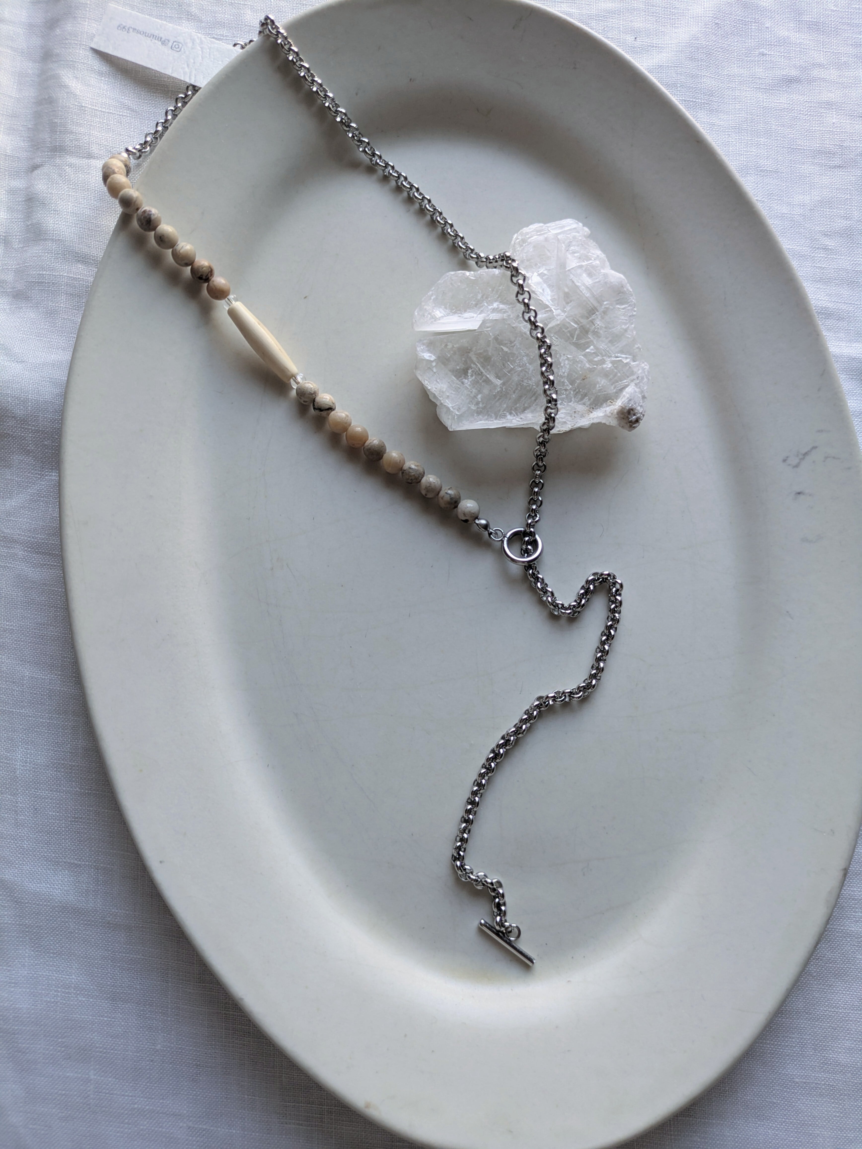 サージカルステンレスを使用したこのネックレスは、汗や水に強く、デイリーユースにも安心の一品です!優雅なニュアンスカラーのアフリカンオパールと、温かみのある水牛ビーズが美しく調和し、どんなコーディネートにも溶け込む魅力的なデザインに仕上げました。