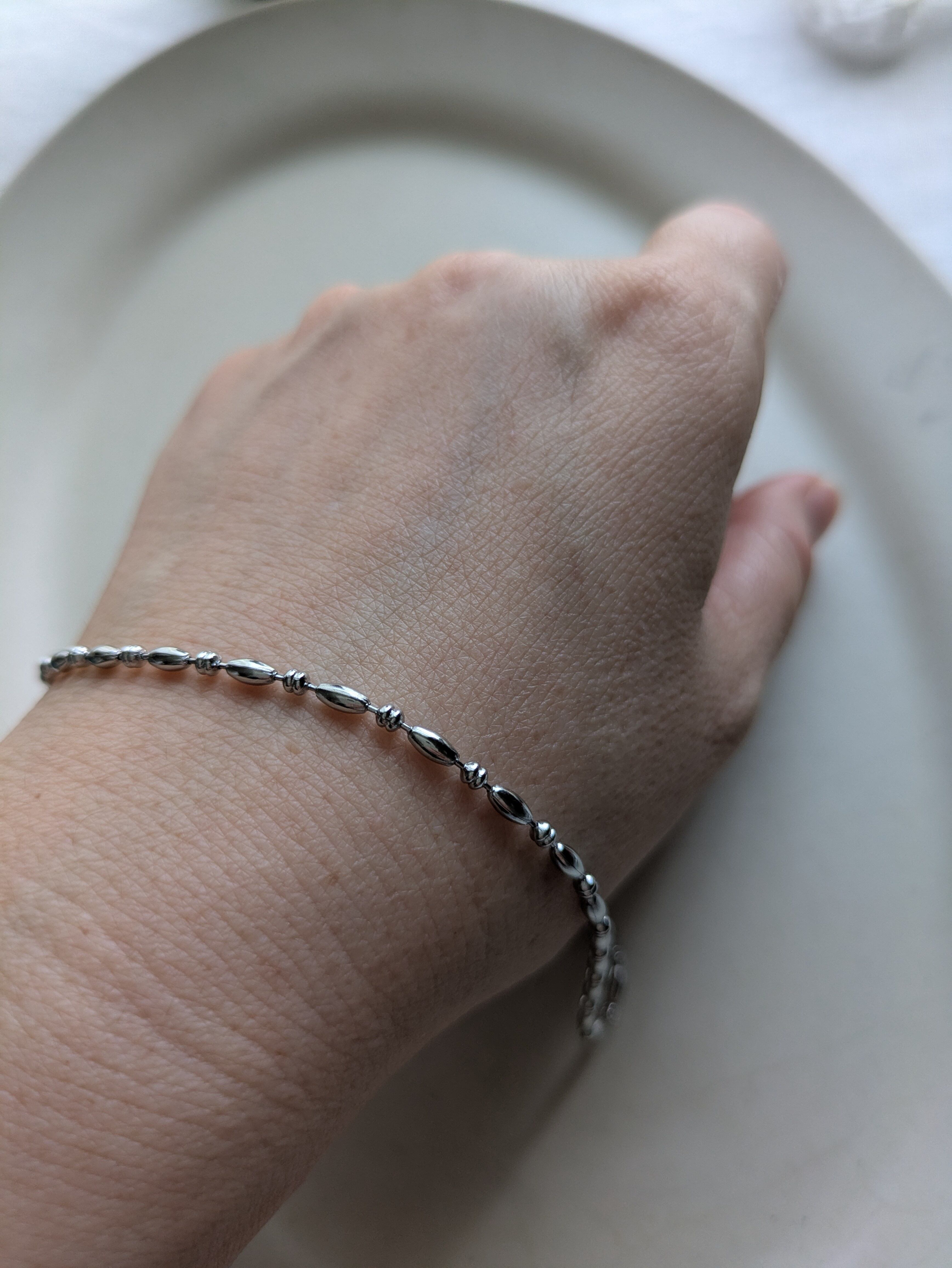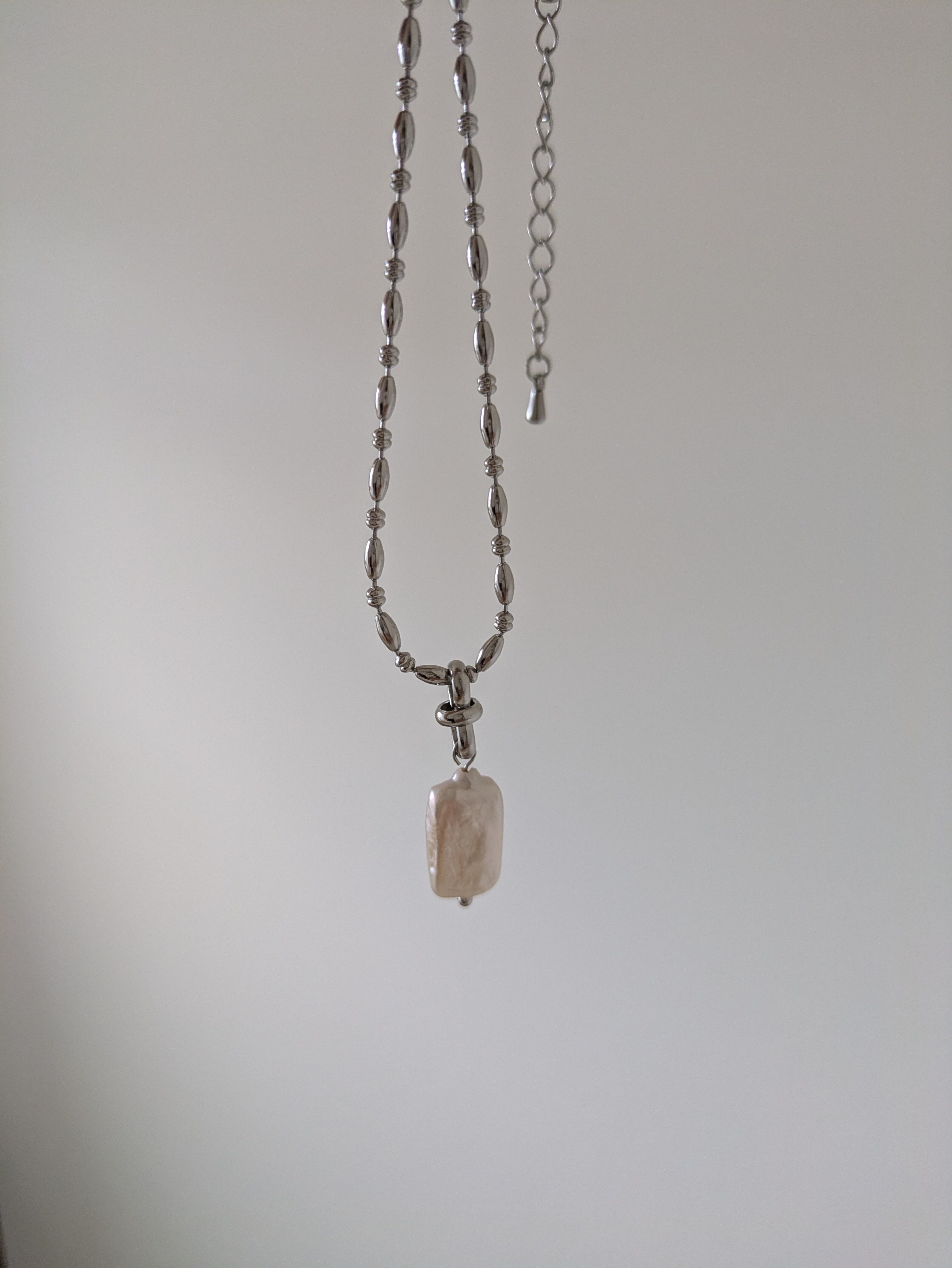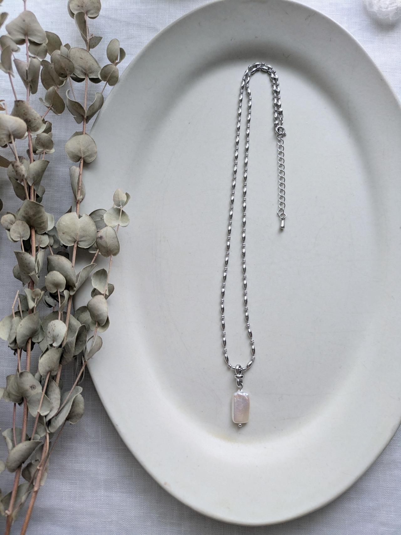 このネックレスは、レクタングルの淡水パールが持つ独自の輝きと、個性的な存在感を放つステンレスチェーンが絶妙に組み合わさった一品です。淡水パールの美しいフォルムが洗練された雰囲気を演出し、スタイルに高級感をプラスします。