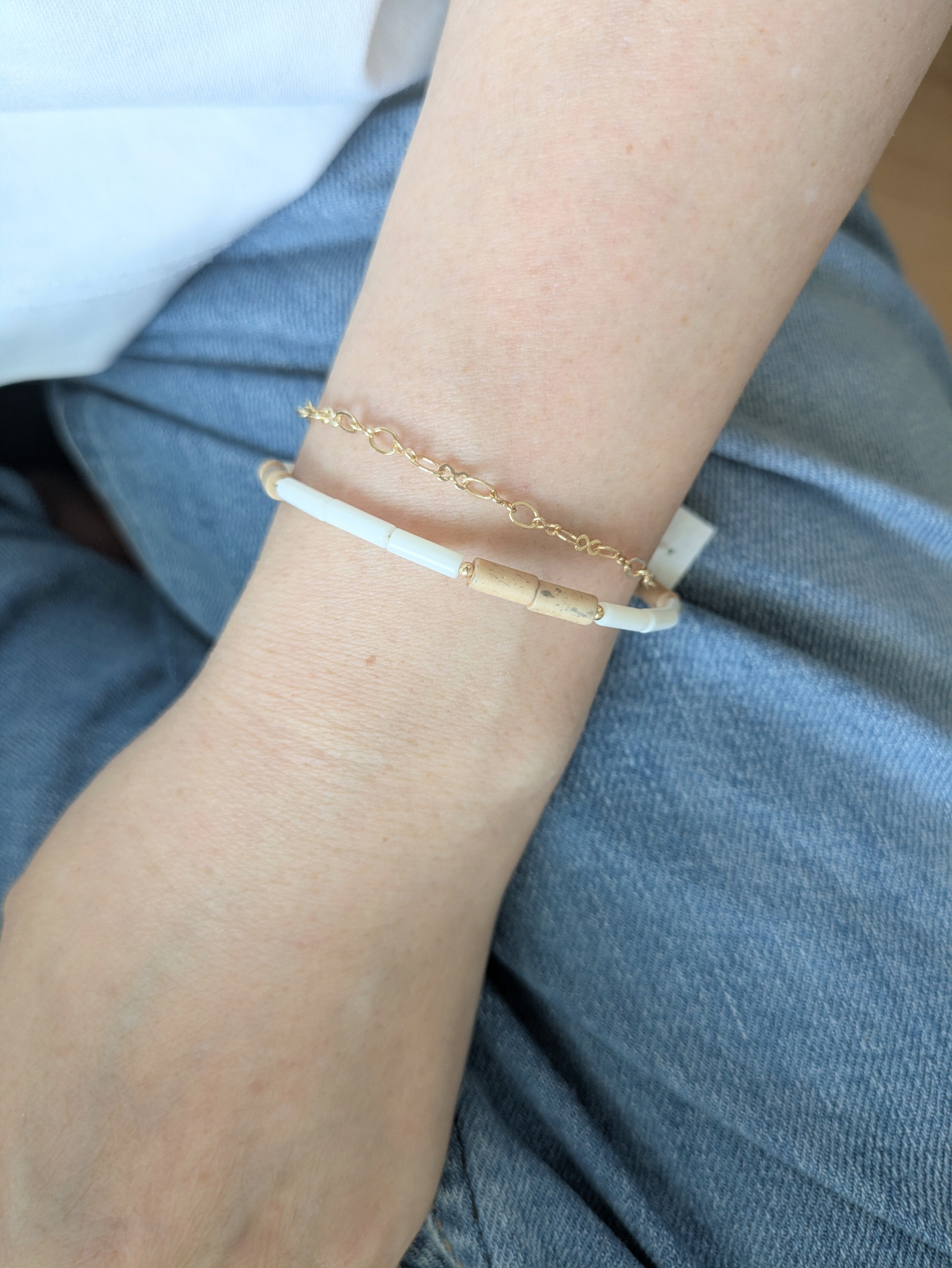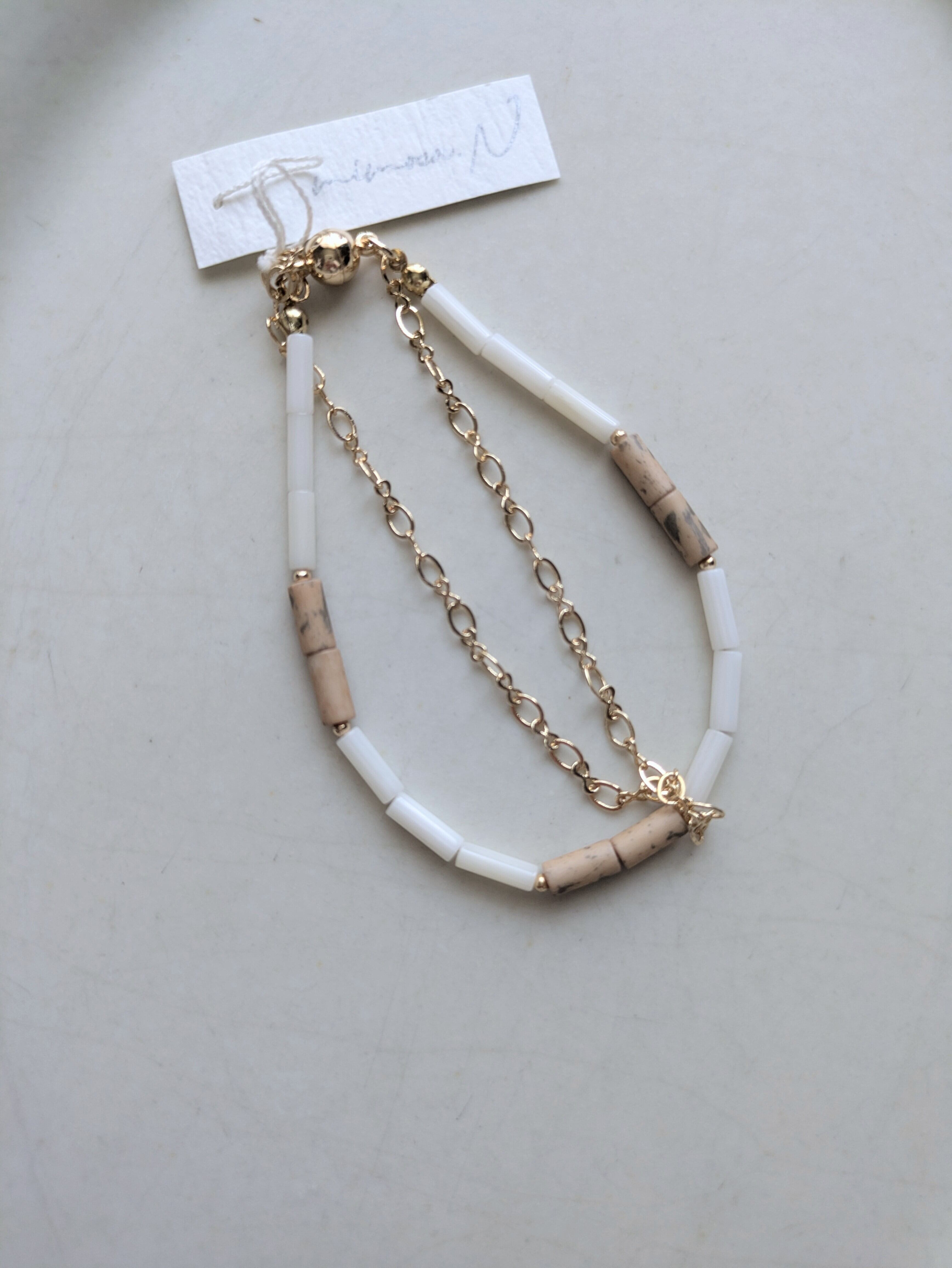この「白珊瑚×ベージュマーブル 14kgfデザインチェーンブレスレット」は、洗練されたデザインが魅力の一品です。主役の白珊瑚は、清らかな白が特徴で、ベージュマーブルビーズとの組み合わせが絶妙なコントラストを生み出しています。さらに、14kgfの∞チェーンを2連にあしらい、華やかさと洗練さをプラス。大人の女性にぴったりな爽やかな雰囲気を演出します。