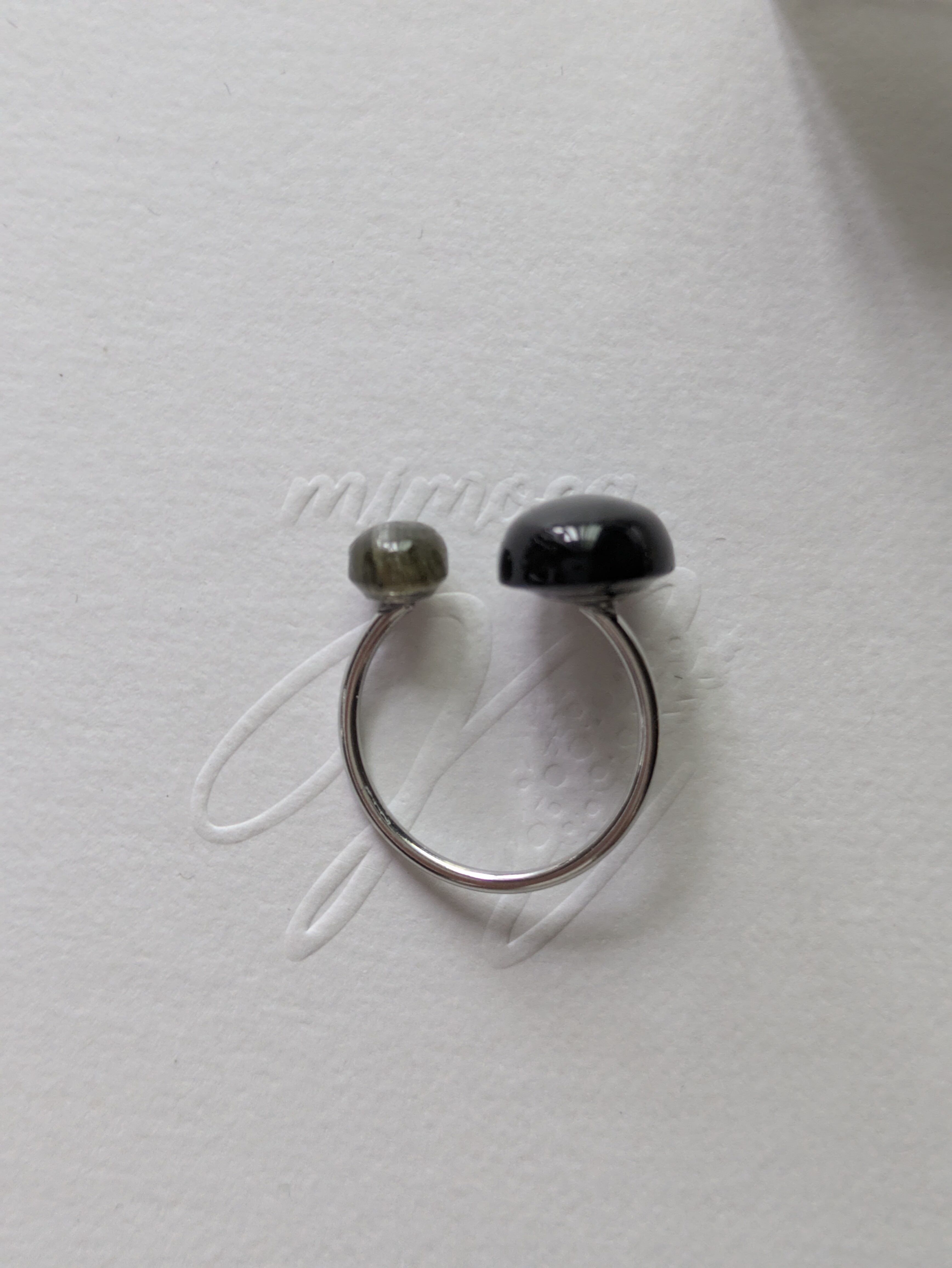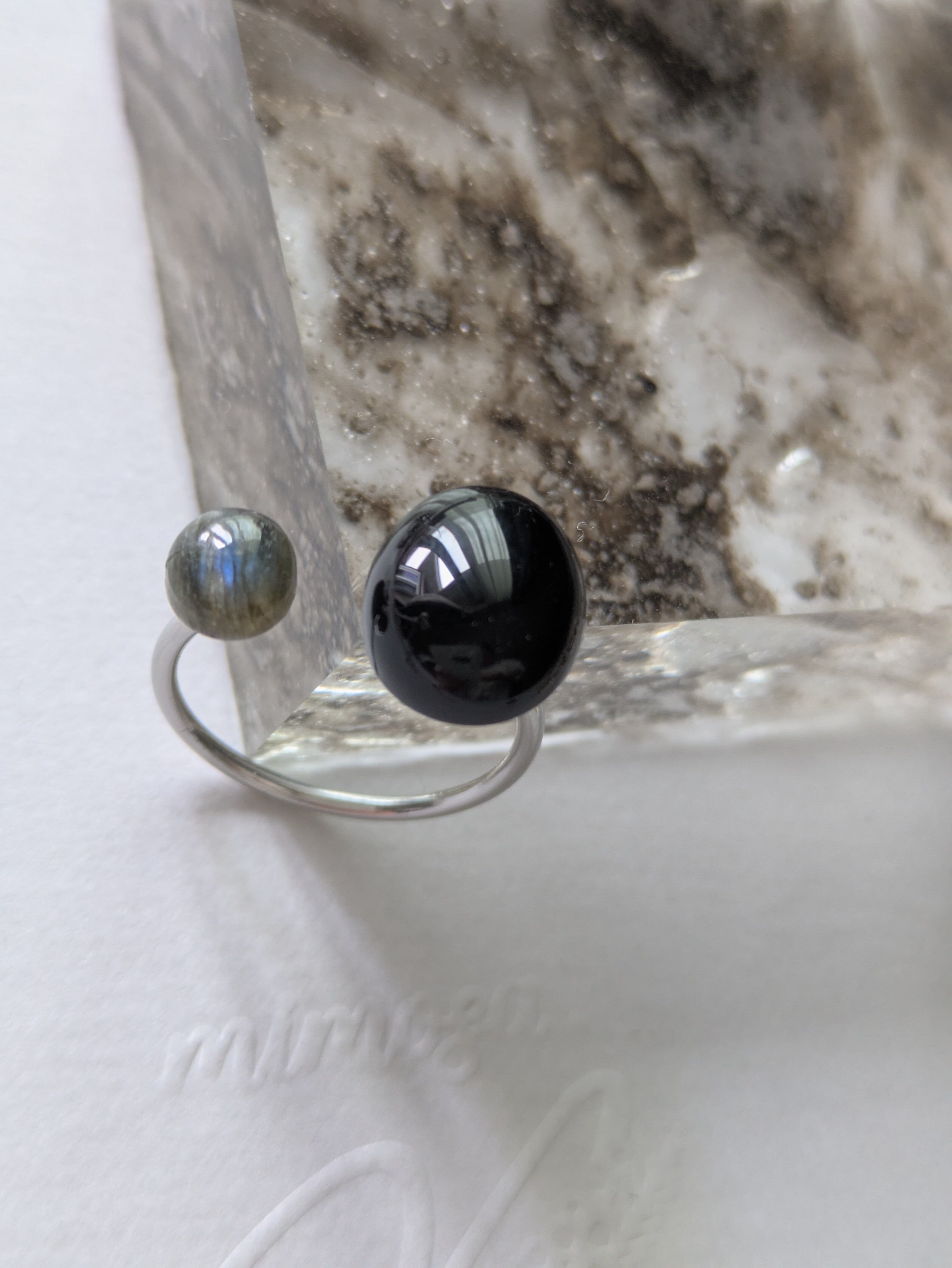 大人気のフォークリングがステンレス台座に生まれ変わり、より洗練されたデザインで登場しました。ブラックのオニキスと神秘的なラブラドライトが組み合わさり、どんなスタイルにも映える美しいアクセントを提供します。1点ものの特別感があり、個性を大切にする方に最適なアイテムです。