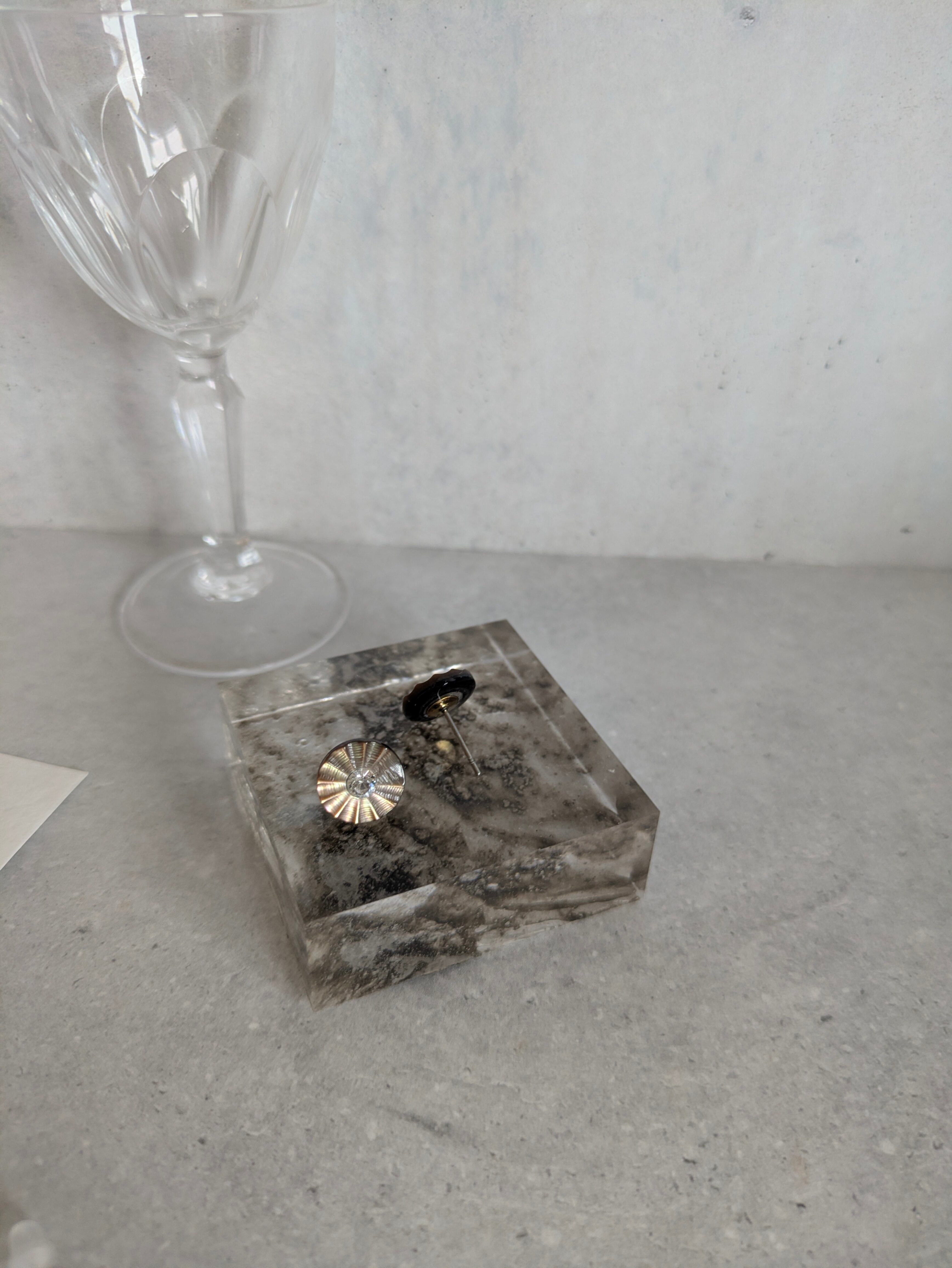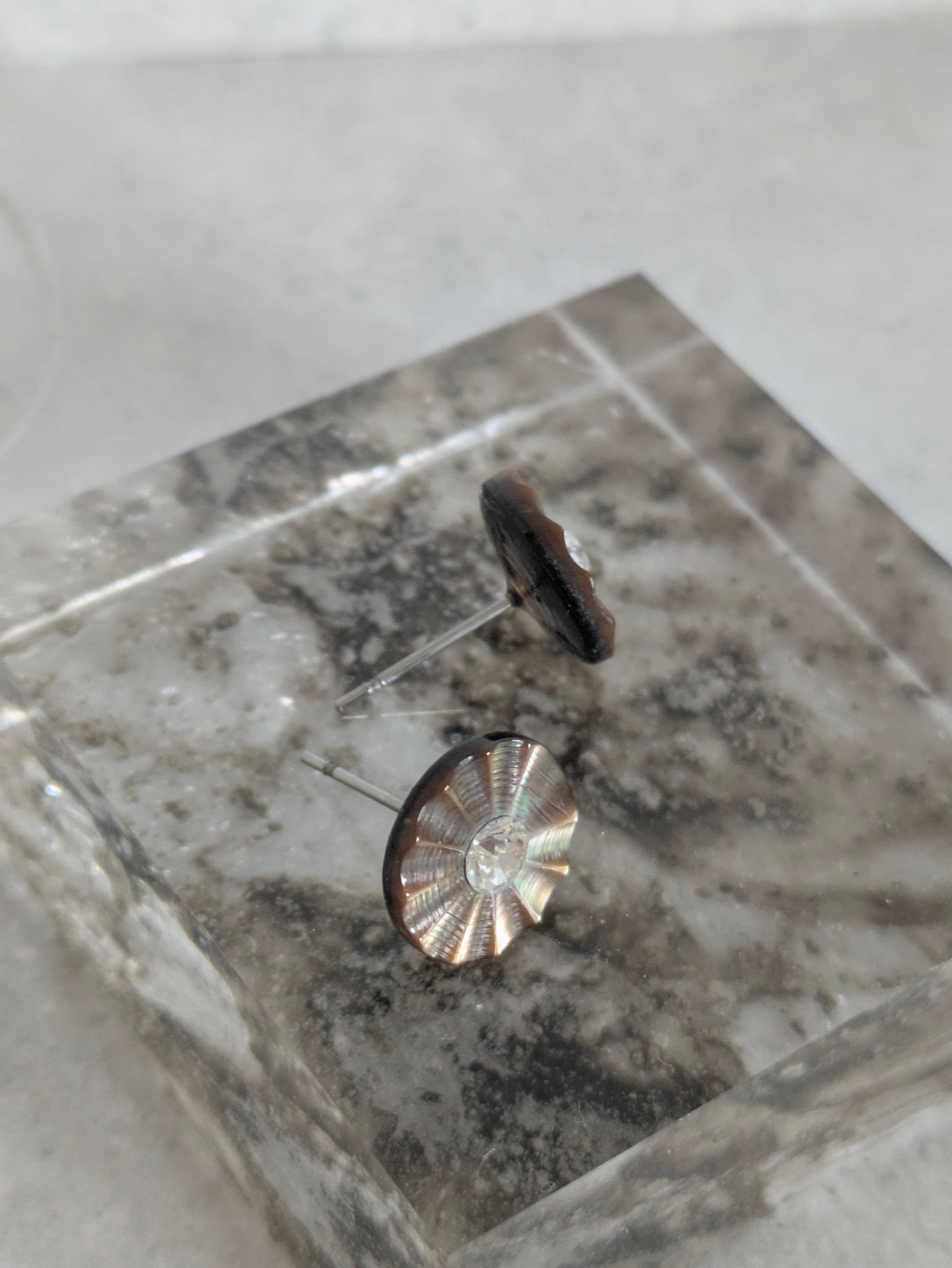表面にガラスビジューがキラリと光り、放射線状に繊細なカットが入った美しいヴィンテージシェルボタンを、一粒ピアスに。
